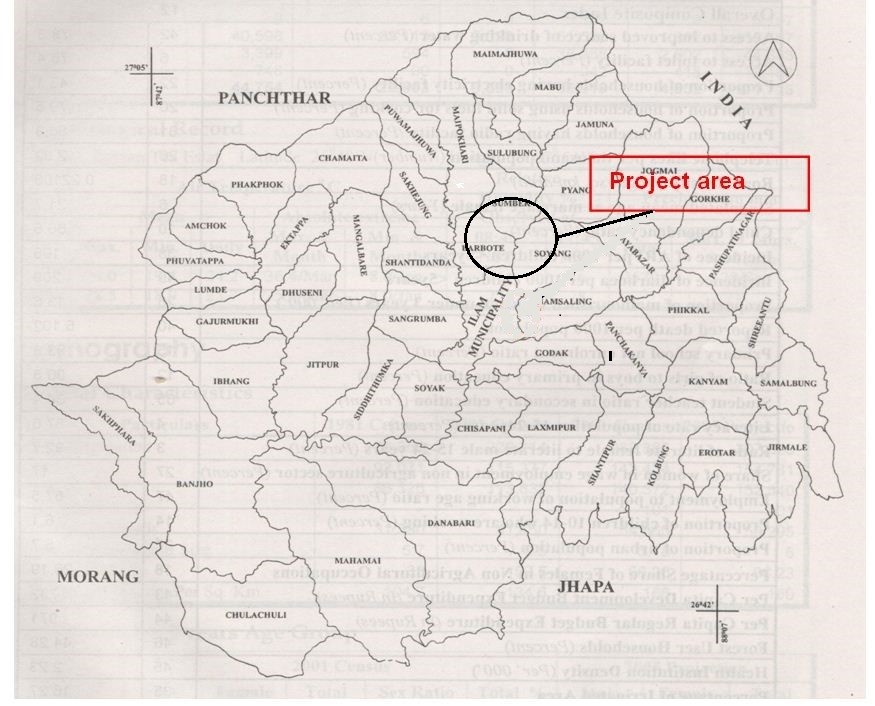 The project lies in Ilam district of Mechi zone in Eastern Development Region of Nepal. The entire project components are located along the right bank of the Mai River within Barobte VDC and Ilam Municipality. The project will tap water from Super Mai Hydropower Tailrace this water will be collected at Headpond via. Approach Canal Which is located abount 150m below the Super Mai Tailrace. The project location is shown in Image below